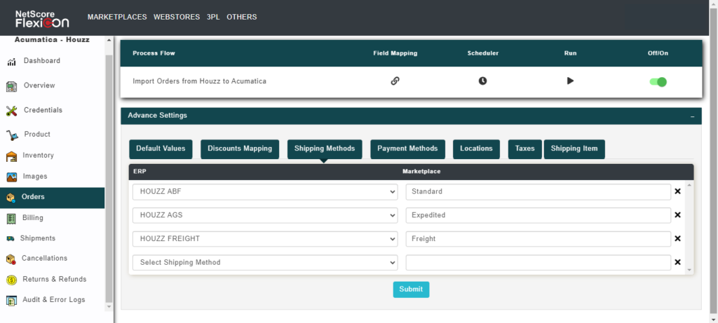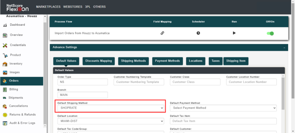 Default Shipping Methods: If the shipping methods are not defined in the Shipping Methods mappings across Acumatica and Houzz in the FlexiCon Configuration module, then the connector considers the defined default shipping method to create an order in Acumatica.