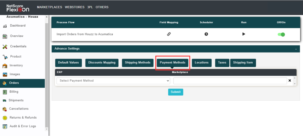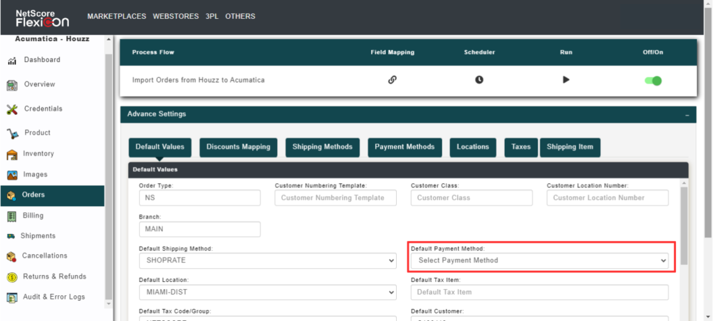 Default Payment method: If payment methods are not defined in the payment method mapping across Acumatica and Houzz in the FlexiCon Configuration module, then the connector considers the defined default payment method and creates the payment record for the order.