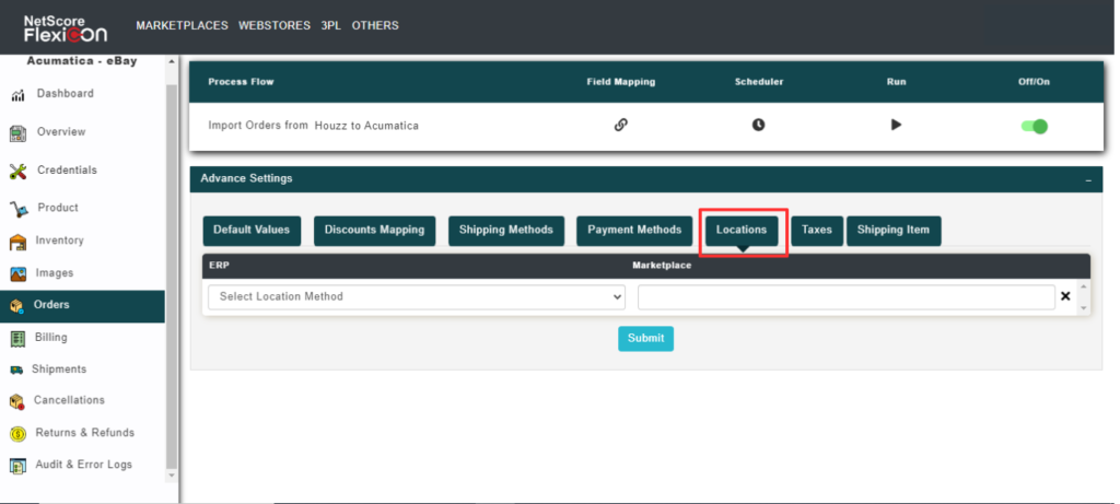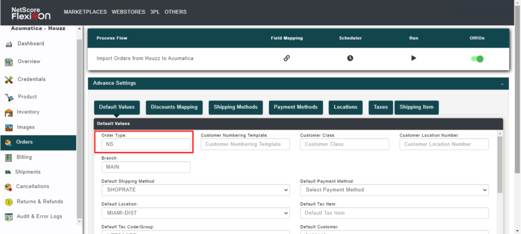 Default Location: To sync the order to Acumatica, define warehouse location in the mapping across Houzz and Acumatica. If it is not defined at the mappings level, then the connector considers the defined default location and creates the respective order in Acumatica.