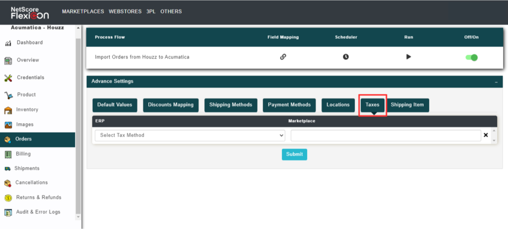 Default Tax codes/Group: To sync taxes in an order to Acumatica, define the mapping across Houzz and Acumatica in FlexiCon Configuration module. If not defined, the connector considers the defined Default Tax codes/group and creates the order in Acumatica.