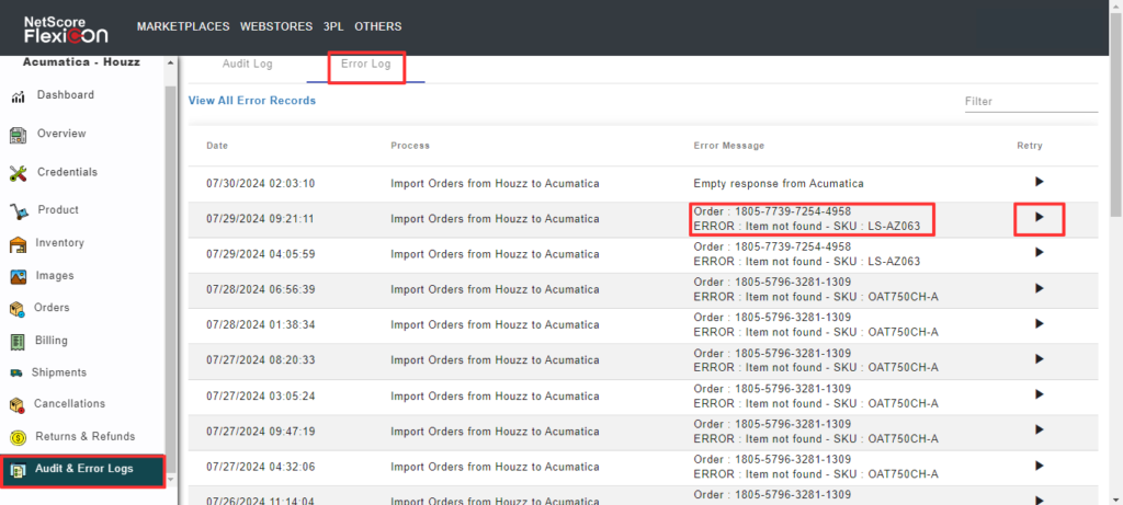 When inventory fails to sync to Houzz marketplace, the FlexiCon connector logs the error at the connector’s Audit and Error Logs window.