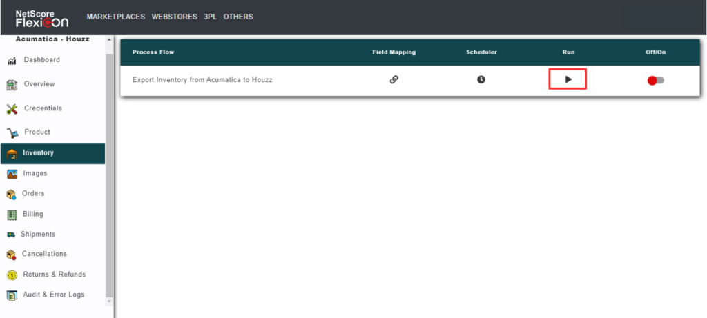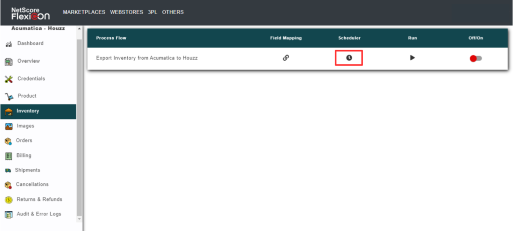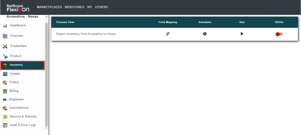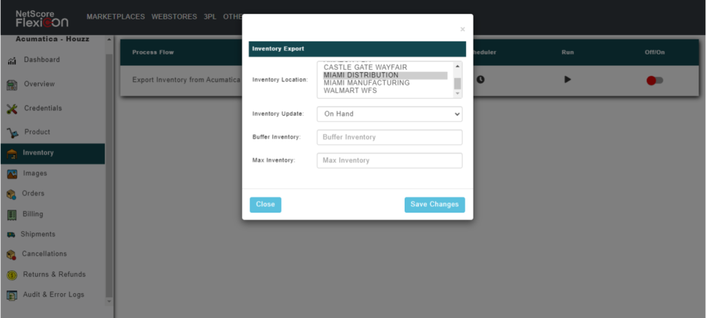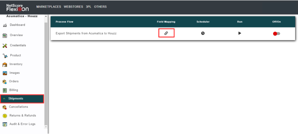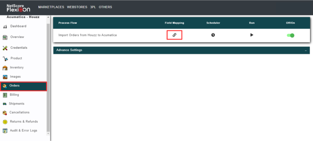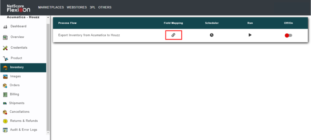 - To export inventory from Acumatica to Houzz, select the Field Mapping icon, which will open a pop-up window to configure the inventory location and other details.