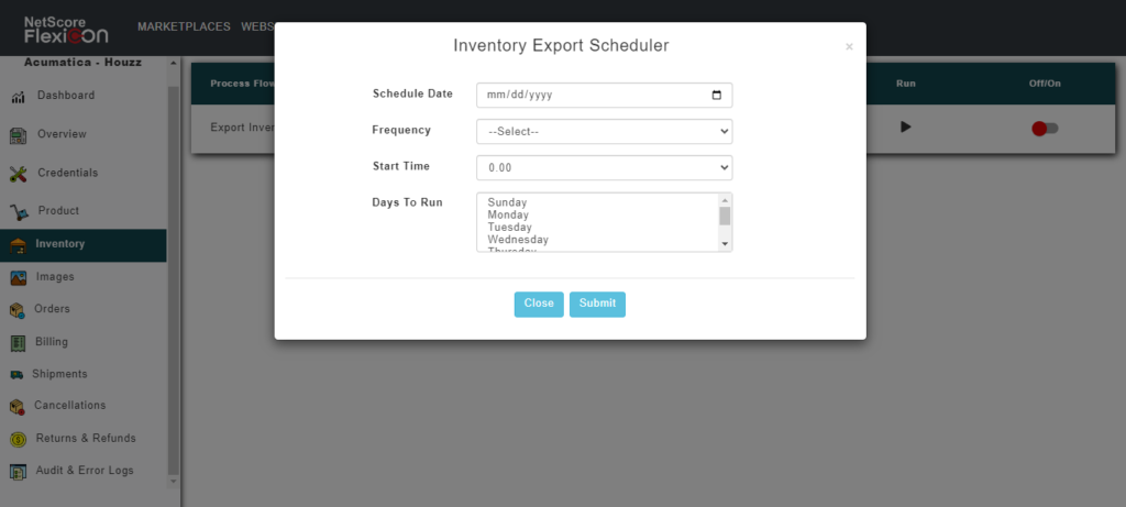 - To schedule the inventory export process, select the Scheduler iconA pop-up window is displayed, in which you can configure the Schedule date, Frequency, Start Time, and Days to run the schedule.