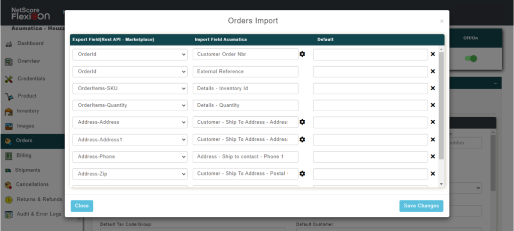 Before trying to import orders from Houzz to Acumatica, do the following configurations in the FlexiCon configuration module.
