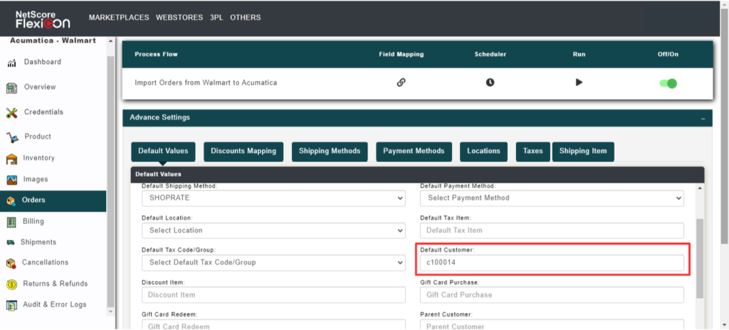 Default Customer: Default Customer signifies that all the orders from Wayfair must be mapped to a single default customer.