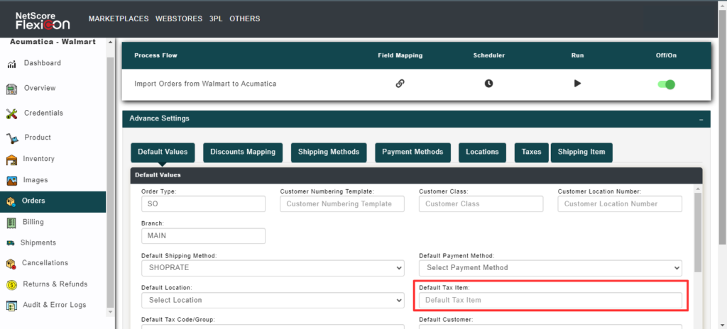 Default Tax Item: To add tax as a line item during an order sync to Acumatica, define a non-stock item as Default Tax Item to hold tax values for the order in Acumatica.