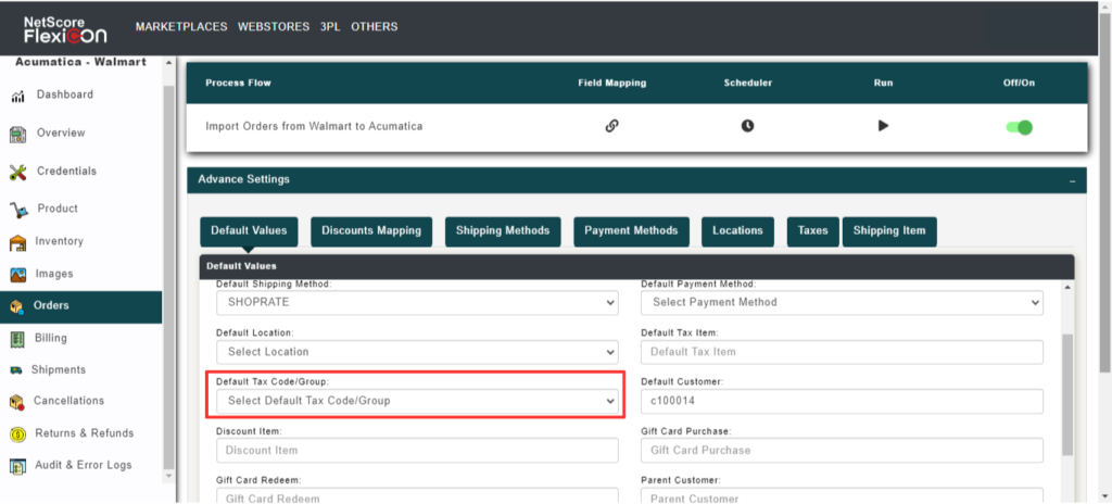 Default Tax codes/Group: To sync taxes in an order to Acumatica, define the mapping across Wayfair and Acumatica in FlexiCon Configuration module. If not defined, the connector considers the defined Default Tax codes/group and creates the order in Acumatica.