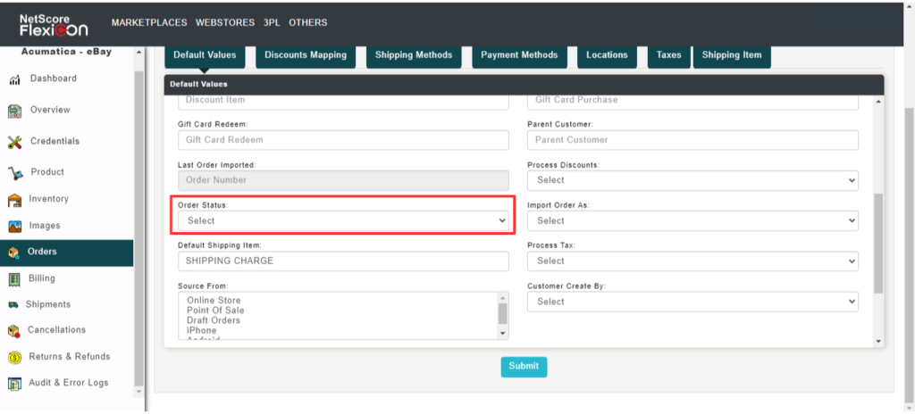 Order Status: Defining order status at the FlexiCon customer configuration module provides a provision for the connector to sync orders from Wayfair to Acumatica based on the order status.