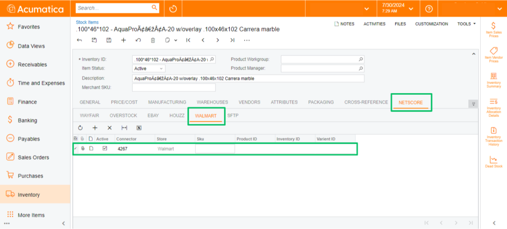 Ensure that the respective stock item is associated with respective marketplace on Acumatica.