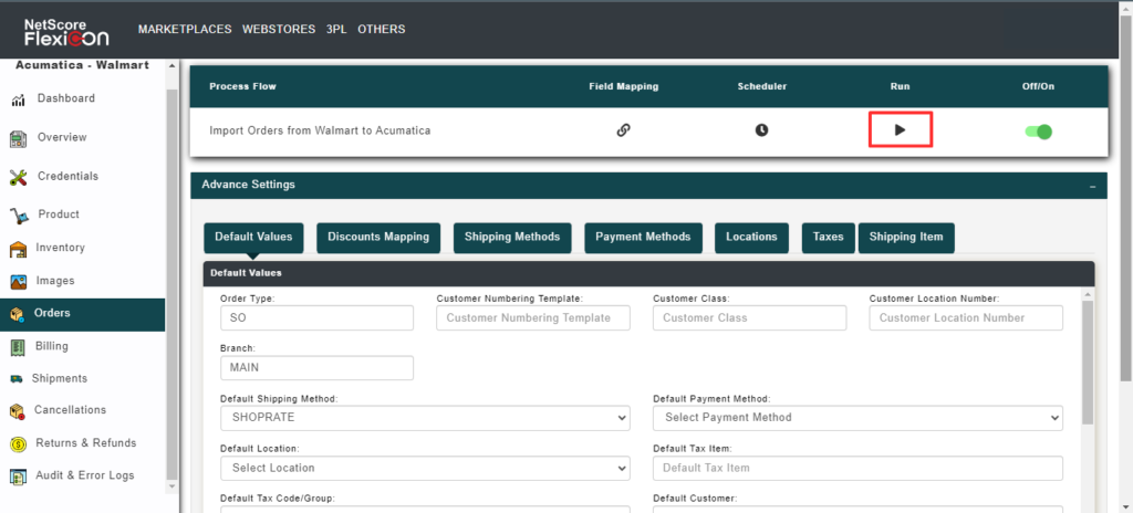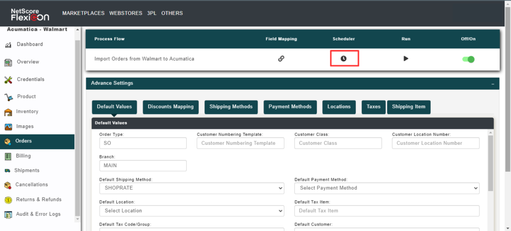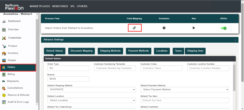 Default Location: To sync the order to Acumatica, define warehouse location in the mapping across Wayfair and Acumatica. If it is not defined at the mappings level, then the connector considers the defined default location and creates the respective order in Acumatica.
