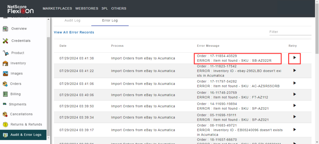 When an order fails to sync to Acumatica, the FlexiCon connector logs the error at the connector’s Audit and Error Logs window.